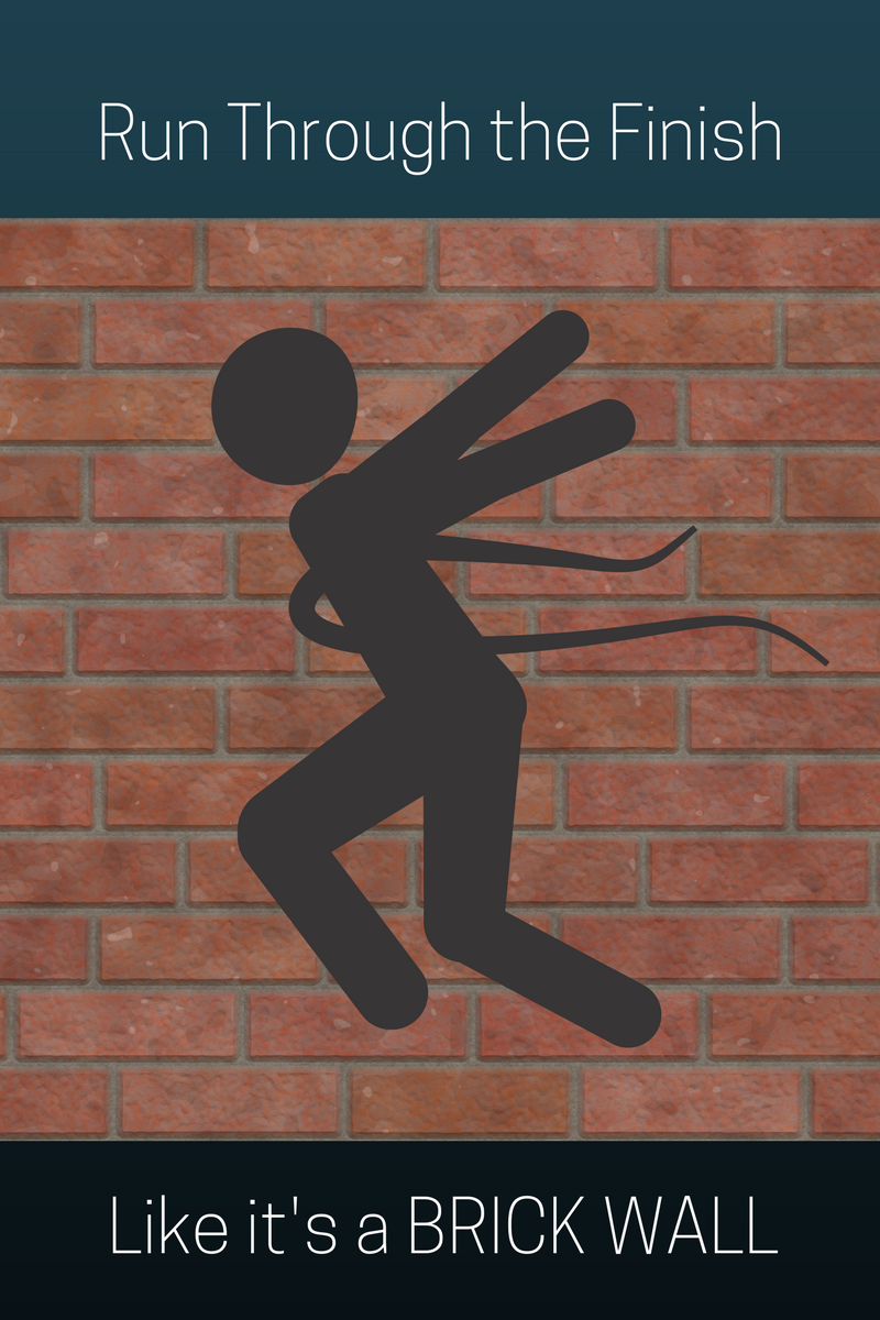 When track athletes are running a race, the only thing in their sight is that finish line. They want to get to the finish line as fast as they possibly can. Now for each distance to be raced, there is a different strategy. The 100 m dash is a full out sprint, you give your ALL for that 100 meters. There is not a time in the 100 m dash that anyone “floats” to get a bit of recovery. However, in the 800 m race, strategy is a bit different. These athletes cannot physiologically full out sprint the entire 1/2 mile. They need time within their race to recover energy, so they “float”, or run at a lighter intensity, mid race. That being said, both athletes should see the finish line and push as hard as they can at the very end. That finish line is not to be lightly passed through. We run through that finish line like we are trying to break down a brick wall.